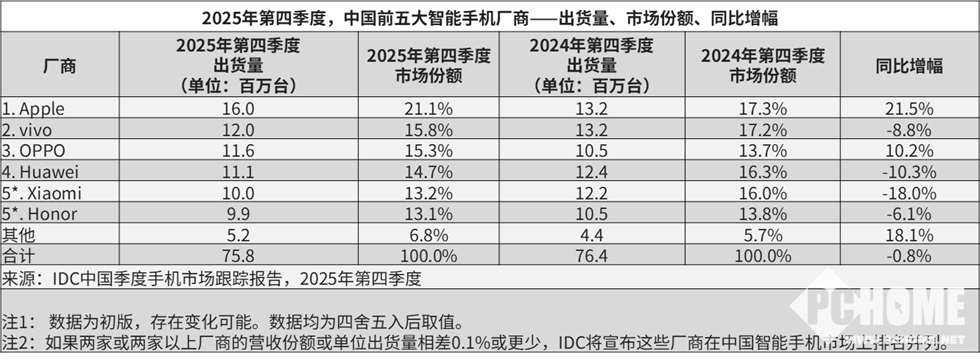 IDC披露的2025年Q4中国智能手机市场报告显示,苹果的出货量为1600万台,同比飙升21.5%,位列第一。IDC认为,苹果出货量飙升,主要是因为iPhone 17系列极具吸引力,并且在热销态势下,苹果在官方渠道为iPhone 17 Pro与Pro Max机型提供300元优惠,进一步激发消费者购机热情。