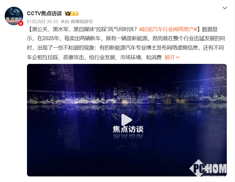 1月30日消息,央视《焦点访谈》发布专题报道,聚焦汽车行业网络乱象,披露大V博主恶意造谣、企业互黑、高管亲自下场拉踩、车主遭网暴甚至线下攻击等车企乱象。