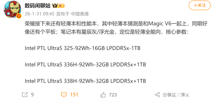 2026年1月31日,数码博主“数码闲聊站”公布了三款荣耀笔记本电脑新品的核心配置。