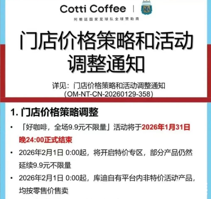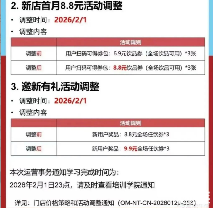 根据品牌总部向加盟商下发的通知,全场9.9元不限量”活动将于2026年1月31日24时正式结束,2月1日0时起,库迪将设立“特价专区”,仅保留部分产品延续9.9元不限量政策,其余非特价产品均按零售价售卖。此外,新店首月8.8元优惠活动也同步调整,原用户扫码可获3张6.9元饮品券,调整后变为3张8.8元券,优惠力度显著收缩。邀新有礼活动也有所调整,新用户奖品由原先的3张8.8元全场任饮券调整为3张9.9元全场任饮券。