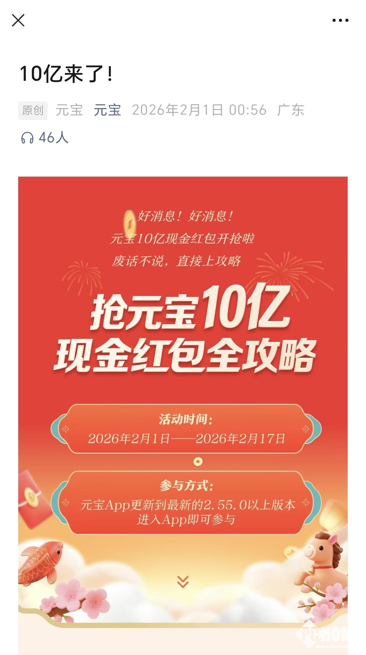 据悉,2026年腾讯元宝“上元宝,分10亿”现金活动,2月1日0点至2月17日举行,用户更新元宝App至最新版,点击首页底部“抢10亿”即可参与。每日登录得5次基础抽奖,完成AI对话、浏览、分享等任务可额外获40+次抽奖机会,有机会抽现金红包、万元小马卡(限量100张)、膨胀卡等。还有祝福语红包玩法,输入当日专属祝福语可触发隐藏红包。红包分3轮提现,分别在2月4日、10日、17日零点后,可提现至微信零钱,膨胀卡最高5倍翻倍提现金额。