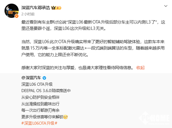 2026年2月2日,深蓝汽车董事长邓承浩在微博发布公开声明,针对近期车主群流传的“深蓝L06最新OTA升级后部分用户可内测L3自动驾驶”的消息进行明确辟谣。