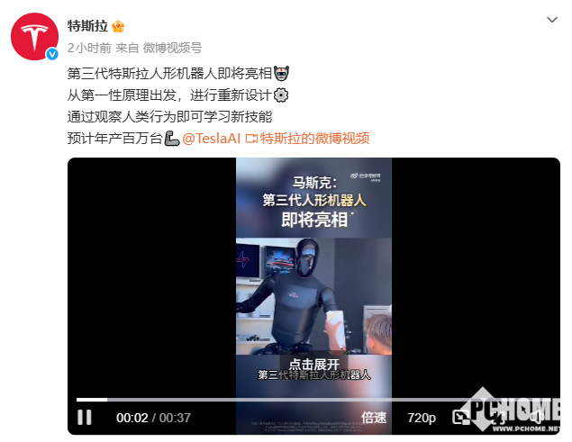 2月2日消息,特斯拉官方微博今日发文表示,特斯拉第三代机器人即将亮相。第三代机器人从第一性原理出发进行重新设计,通过观察人类行为即可学习新技能,预计将实现年产百万台。