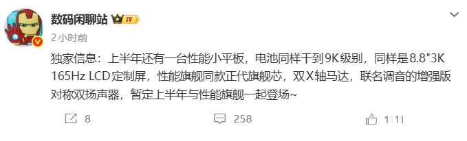 2026年2月2日,数码博主“数码闲聊站”爆料称,上半年还有一台性能小平板,将与性能旗舰一起登场。评论区猜测这款平板预计为小米Redmi K Pad 2。
