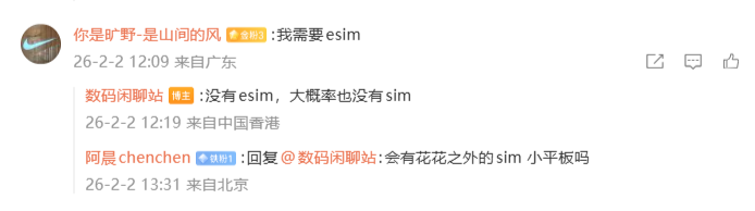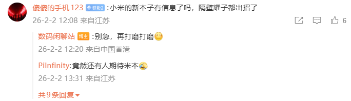 有网友询问该机是否有eSIM,博主表示:“没有eSIM,大概率也没有SIM。”另外还有网友询问小米是否会推出新笔记本,博主回复称:“别急,再打磨打磨。”