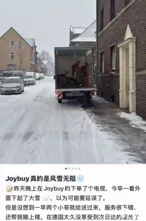 值得注意的是,有海外网友在社交平台分享购物经历,京东Joybuy在德国、荷兰等国家和地区,在大雪天气的情况下,依然可以提供“次日达”服务。