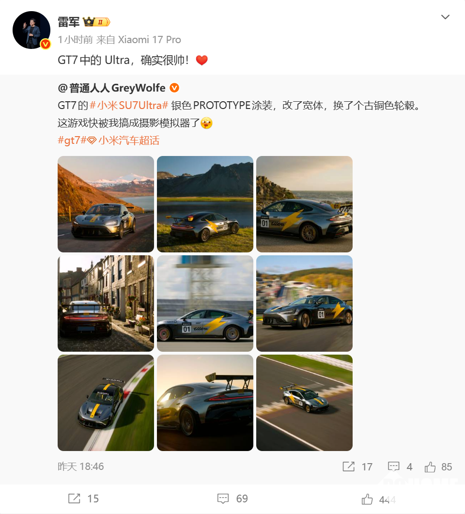 2月2日,近日,已正式入驻全球顶级赛车游戏《Gran Turismo 7》(简称《GT7》)的小米SU7 Ultra,其游戏内外观细节曝光,引发车迷与玩家热议,雷军第一时间转发相关动态,直言“GT7中的Ultra,确实很帅!”。