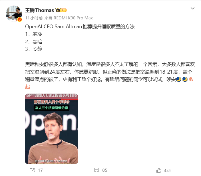 2026年2月3日消息,今日宜休科技公司创始人王腾发布博文,分享助睡秘籍。