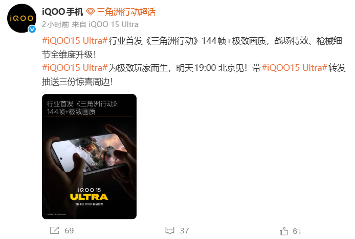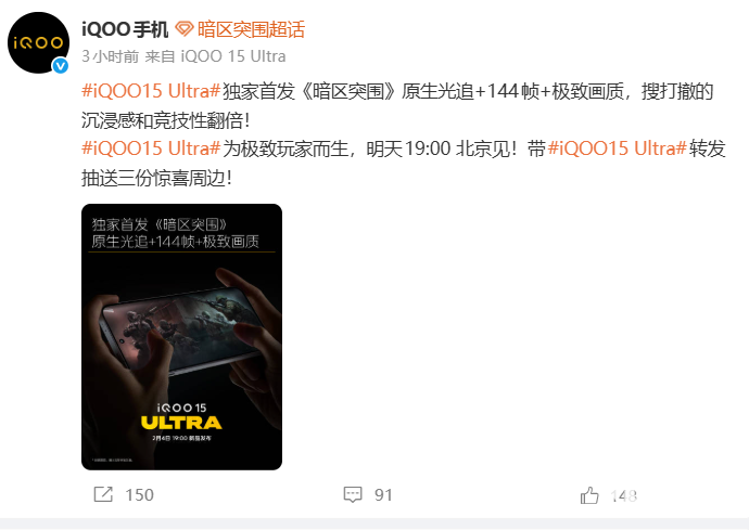 2026年2月3日,iQOO官方正式官宣iQOO 15 Ultra手机将行业首发《三角洲行动》《暗区突围》游戏144帧+极致画质,其中《暗区突围》实现原生光追+144帧+极致画质,将于明晚19点整正式发布。