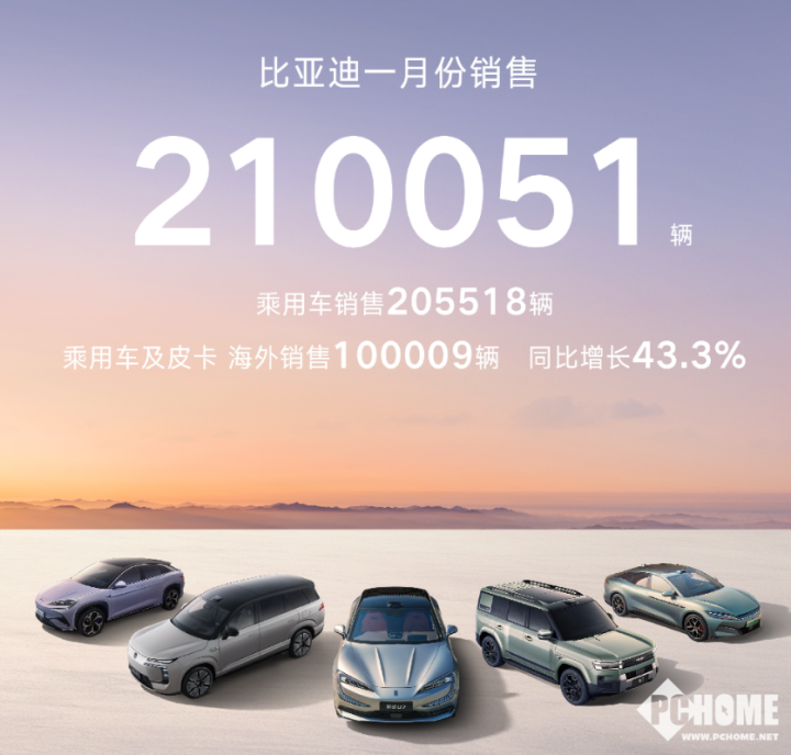 2月1日,李云飞公布比亚迪比亚迪1月销量数据。比亚迪1月销售210051辆,获中国新能源汽车销量冠军;乘用车及皮卡海外销售100009辆,同比增长43.3%;新能源汽车累计销售超1530万辆。