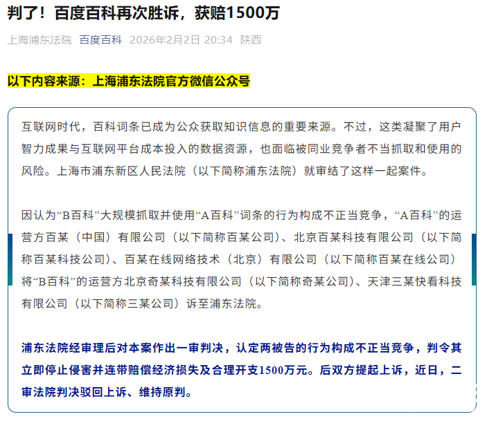 2026年2月3日消息,昨日,百度百科公众号转发上海市浦东法院《百科词条遭同业竞争者抓取使用,法院判赔1500万》一文。