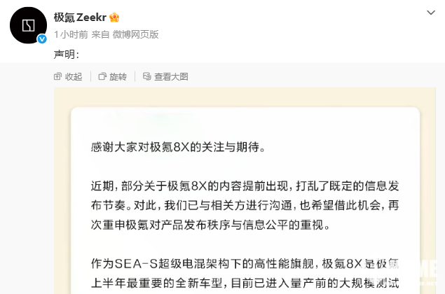 近期部分关于极氪8X的内容提前出现,打乱了官方既定的信息发布节奏。对此,极氪官方今日发布声明表示,已与相关方进行沟通,希望借此机会,再次重申极氪对产品发布秩序与信息公平的重视。