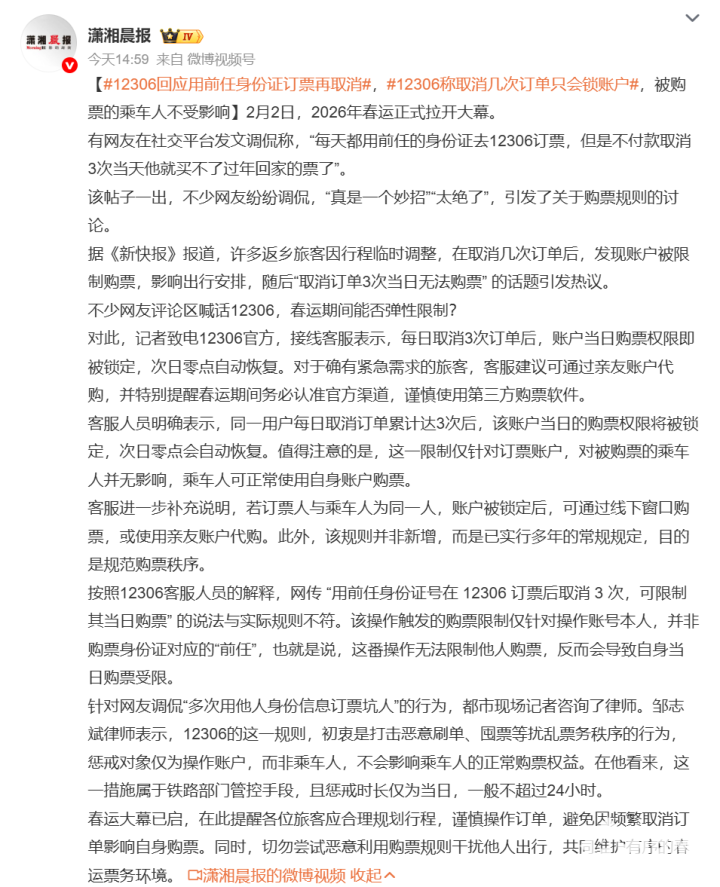 2月3日,春运大幕启幕之际,一则“用前任身份证在12306订票再取消3次,可让对方当日无法购票”的言论在社交平台引发热议。对此,12306官方客服正式回应,明确该说法与实际购票规则不符。