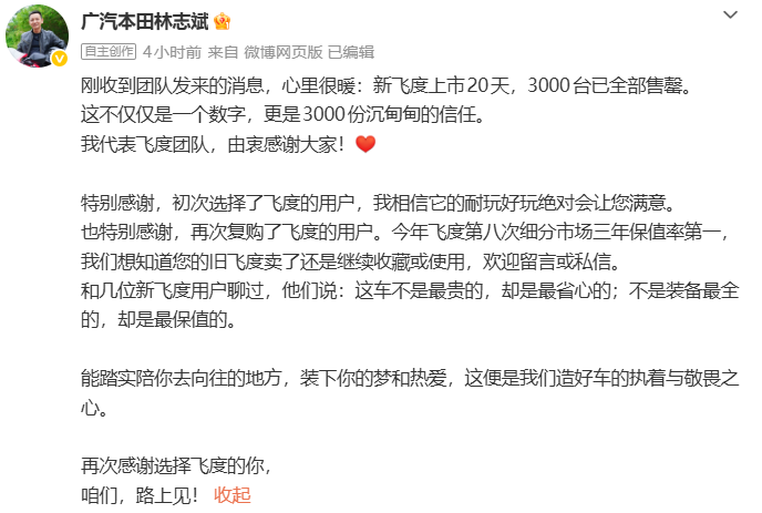 2026年2月4日,广汽本田汽车有限公司副总经理林志斌宣布,新飞度1.5L CVT焕新版上市仅20天,全国限量3000台已全部售罄。