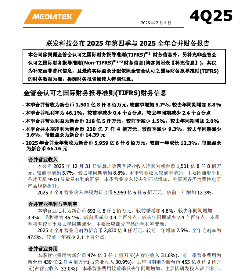2026年2月4日,联发科技公布2025年第四季及全年合并财务报告。财报显示,联发科Q4合并营收达1501.88亿新台币,环比增长5.7%,同比增长8.8%,增长动力主要来自旗舰手机芯片天玑9500放量及有利汇率变动,同时消费电子规格升级也带动同比营收提升。