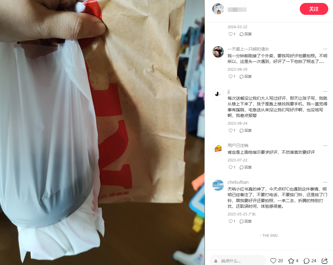 事实上,肯德基门店主动索要“五星好评”的行为并非个例。在社交媒体上,有网友反映,在肯德基订购的早餐,然后外卖员就堵在(家)门口要求拍照好评。在评论区还有网友称,一个人在家穿着睡裙,谁懂一个人 还光着腿,被堵门口要好评拍照。
