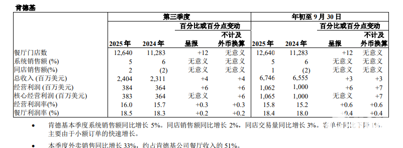 据肯德基母公司百胜中国财报显示,2025年第三季度,肯德基中国门店已达12640家,外卖销售额同比增长33%,占餐厅收入比例升至51%。百胜中国CEO屈翠容接受采访时表示,预计到2028年,百胜中国门店总数超过2.5万家,经营利润率不低于11.5%。