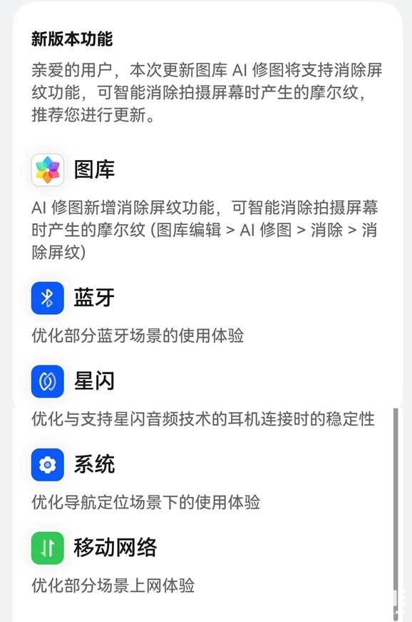 此外,本次更新还同步优化了蓝牙连接和星闪音频连接的稳定性、导航定位精度及部分场景网络体验,进一步提升手机使用流畅度。