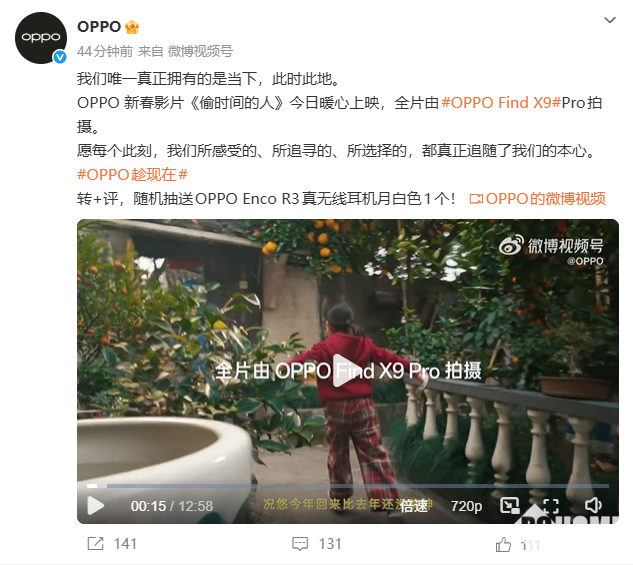 2026年2月5日,OPPO新春奇幻温情影片《偷时间的人》全平台正式上线。该片全程使用OPPO Find X9 Pro手机拍摄,以“时间”为意象,讲述主角在错位时空中找回自我、回归当下的暖心故事。