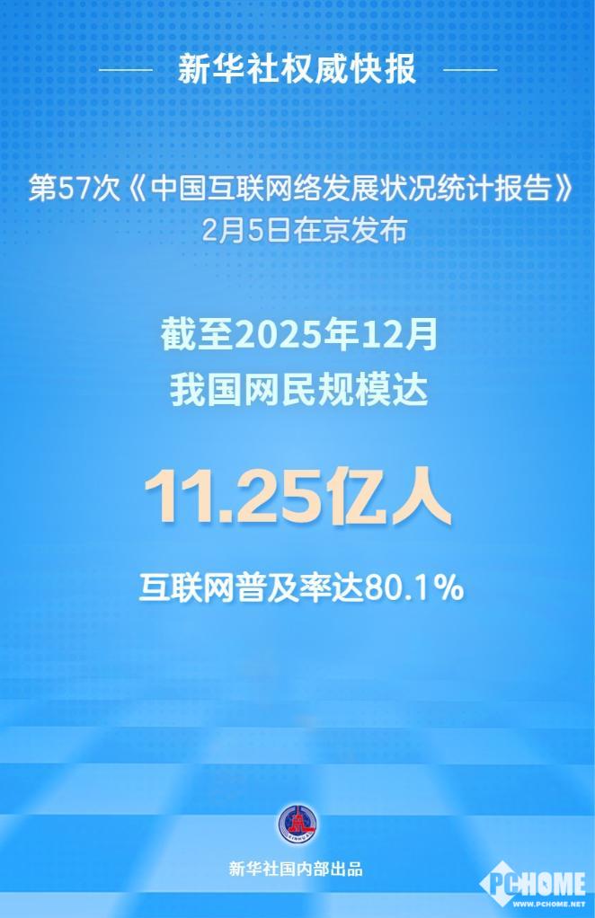 2026年2月5日,第57次《中国互联网络发展状况统计报告》发布,数据显示,截至2025年12月,我国网民规模攀升至11.25亿,互联网普及率突破80%,数字发展红利持续惠及更广泛群体。