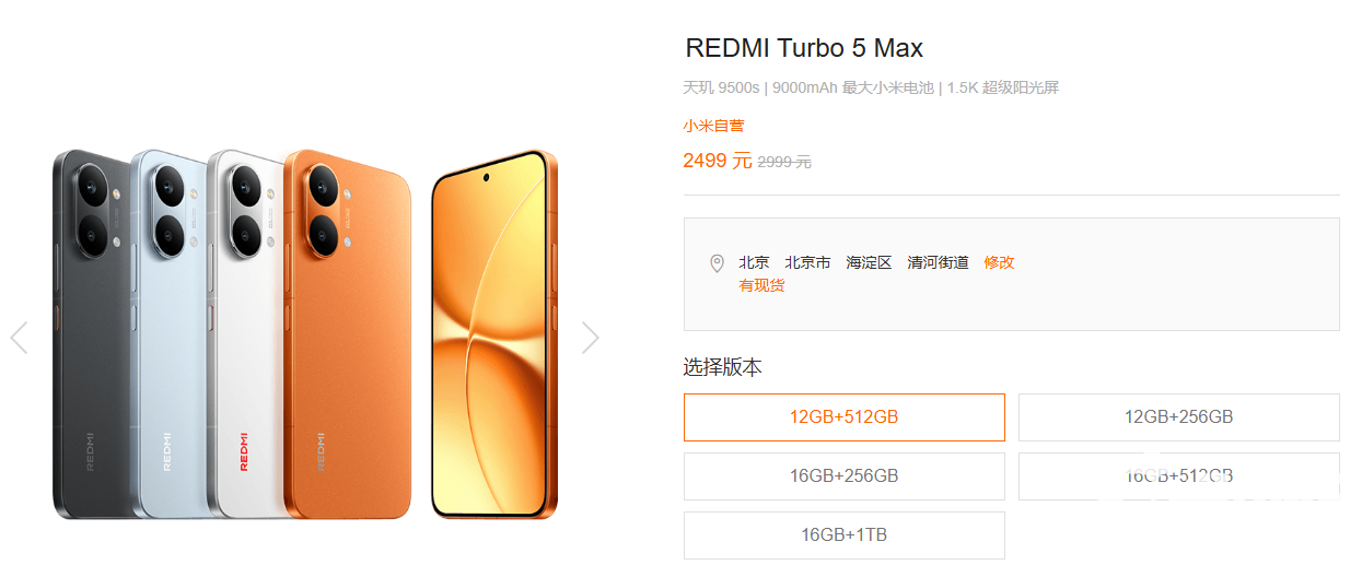 REDMI Turbo 5 Max主打性能与续航,搭载9000mAh小米金沙江电池、高性能处理器与散热系统,以满足游戏、重度使用等用户需求;配备100W有线快充与27W有线反向充电,且系支持了100W PPS公版充电协议,可快速补能并为耳机、手表等设备供电。该机起售价2199元,主打千元档性价比市场,近期新增16GB+1TB顶配版本,定价3399元。