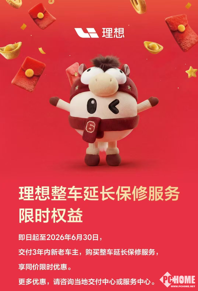 2月5日,理想汽车正式推出整车延长保修服务,针对交付3年内的新老车主开放购买,同时推出限时优惠政策,活动持续至2026年6月30日,为用户用车提供更全面的保障。