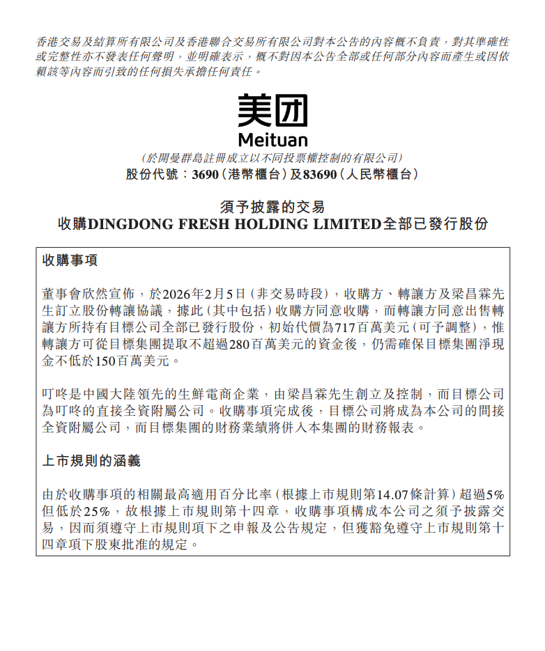 2026年2月5日,美团于香港联交所发布公告,将以约7.17亿美元的初始对价,收购叮咚买菜中国业务100%股权。