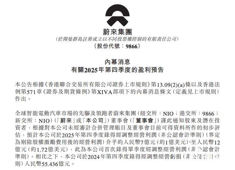 2026年2月5日,蔚来汽车发布公告称,预计2025年Q4,录得经调整经营利润7亿元-12亿元,为公司首次录得单季度经调整经营利润。对比而言,2024年Q4,蔚来汽车录得经调整经营亏损(非公认会计准则)55.44亿元。