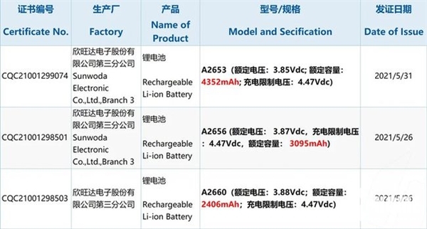 通过查询CQC中国质量认证情况可以看到,早在5月末就有3款来自欣旺达(苹果电池供应商)的锂电池通过了认证,型号分别是:A2653、A2656、A2660,这三个型号正好对应了iPhone 13系列的三种尺寸。
