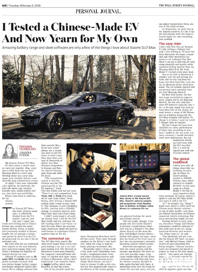 在雷军转发《华尔街日报》报道中还提到,科技专栏作家Joanna Stern找朋友借了辆小米SU7 Max,在美国新泽西试驾了两周,盛赞SU7的驾驶体验和生态。以上两位知名人士的真实评价,是对小米汽车技术路线与产品定义的充分肯定,标志着中国智能电动汽车的技术与体验,正逐渐迈入全球主流车企行列。