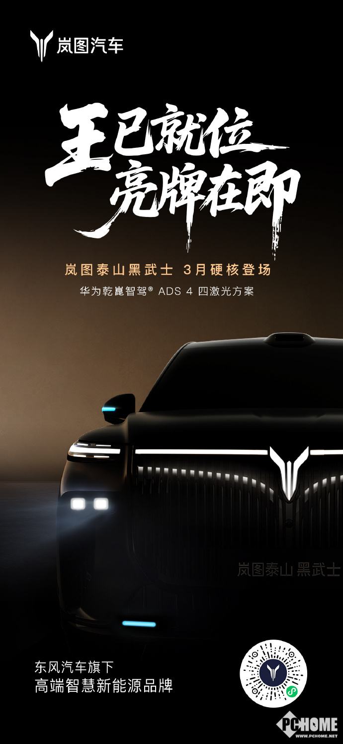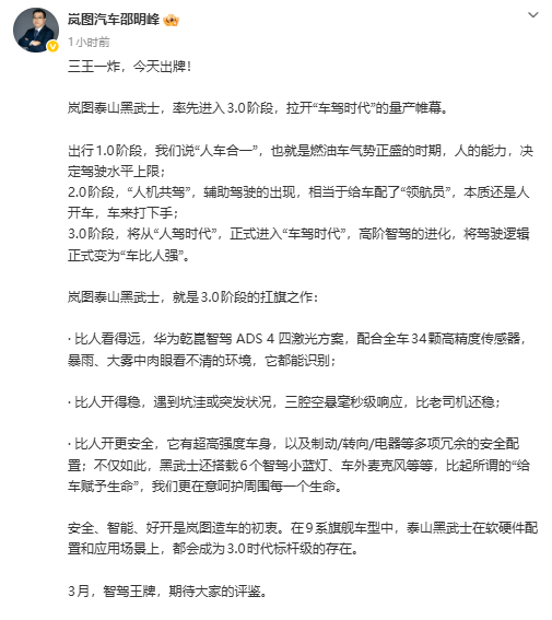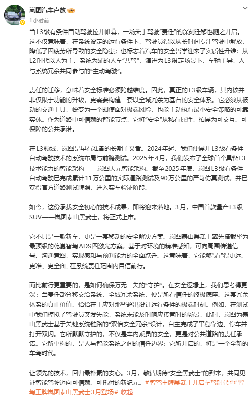 2026年2月9日,岚图汽车科技股份有限公司董事长卢放在微博发文宣布,中国首款量产L3级SUV——岚图泰山黑武士将于3月正式上市。