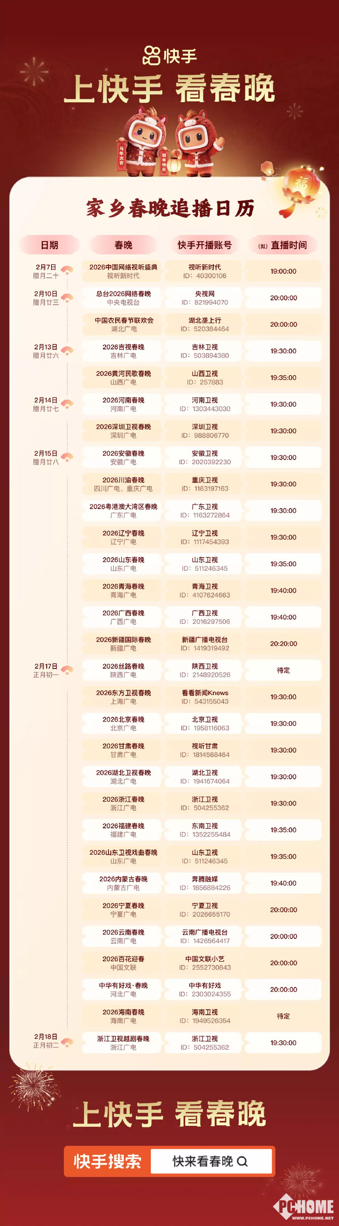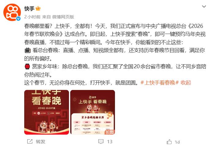 2026年2月9日,快手正式宣布与中央广播电视总台达成合作,成为《2026年春节联欢晚会》官方合作平台。