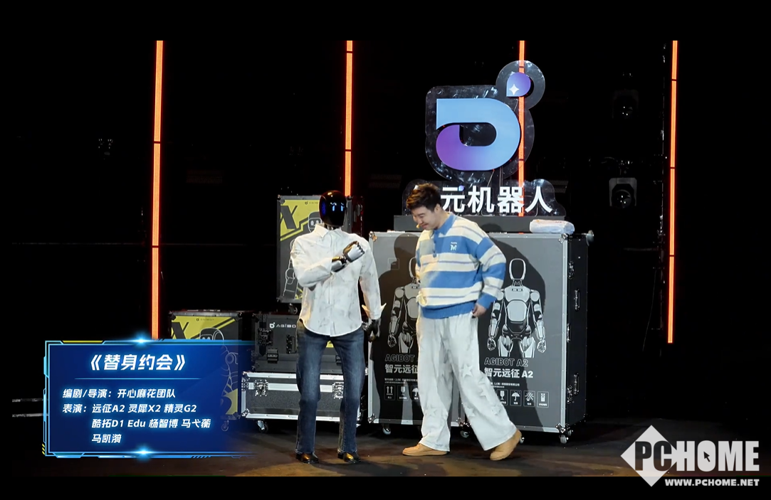 2026年2月9日消息,在智元机器人于昨日晚间举办的全球首个大型机器人晚会《机器人奇妙夜》上,人形机器人不仅带来了唱歌、跳舞、魔术等节目,还首次以主角身份与开心麻花演员同台演绎了喜剧小品《替身约会》。