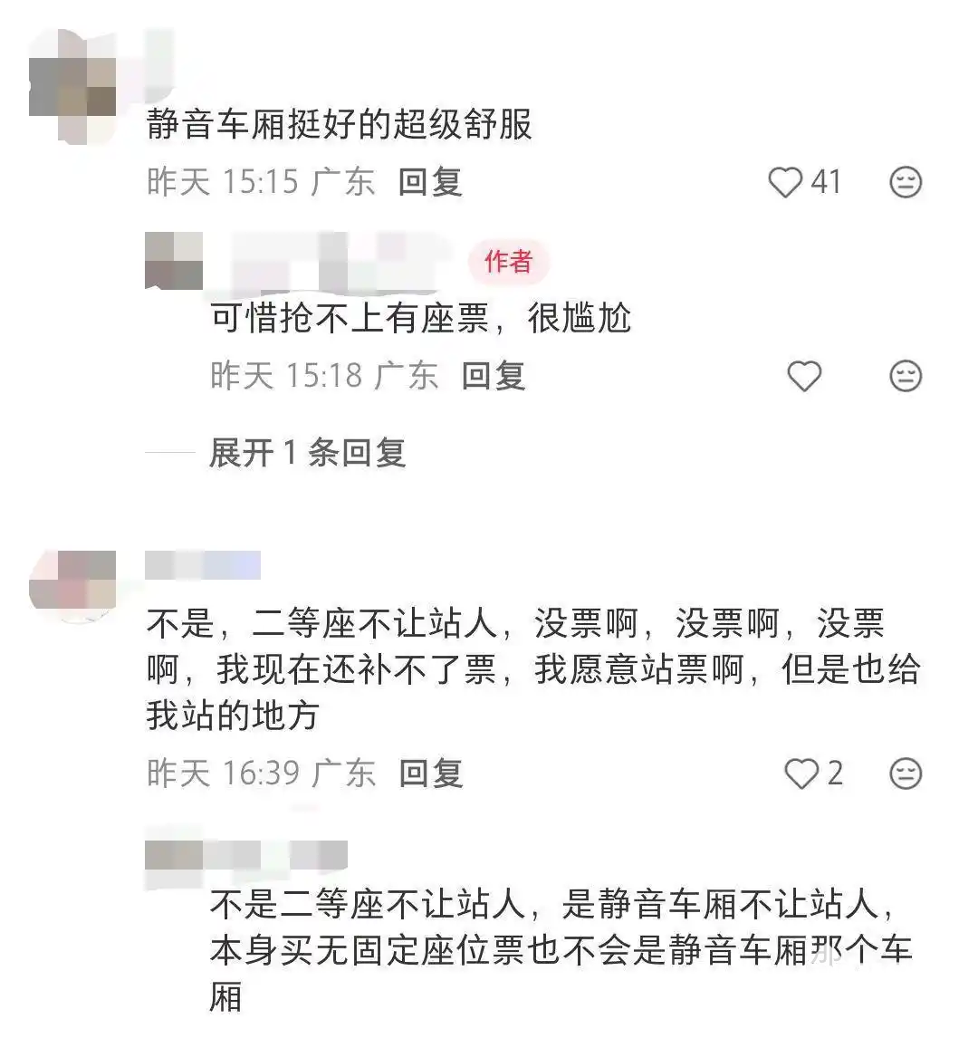 据网友描述,自己买到了高铁无座票,因所在车厢人员较多,便到静音车厢站立等候,尽管全程未发出任何声响,仍被列车工作人员劝离。不少网友对此表示理解,认为静音车厢旨在保障安静出行环境,需严格管控人员流动;也有网友建议,在大客流时段应考虑无座乘客需求,实行弹性管理。