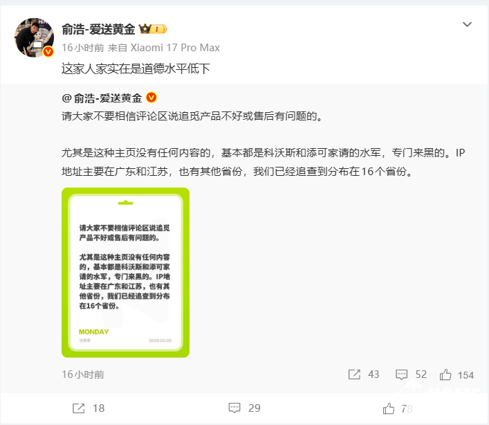 据了解,水军IP主要分布在广东、江苏等16个省份,并明确指控科沃斯、添可是幕后操纵者,俞浩此前还提供过实证:在追觅员工发布的入职视频下,出现大量重复文案的科沃斯产品好评。同时,俞浩自1月底起多次表态将对黑水军“重拳出击”,他提出“魔法对攻魔法”原则,要求团队对黑子“先问候祖宗十八代”,并推出“抽黄金”活动号召网友共同反击。面对指控,科沃斯客服仅表示“无法核实评论真实性”,未直接回应俞浩的指责。