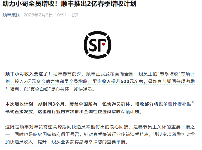 2026年2月9日,顺丰集团正式发布“春季增收”专项计划,宣布投入2亿元专项资金助力全国一线快递员增收,预计人均月收入提升500元左右,计划首期执行周期为3个月,是行业内首次推出全国性快递员增收专项计划。