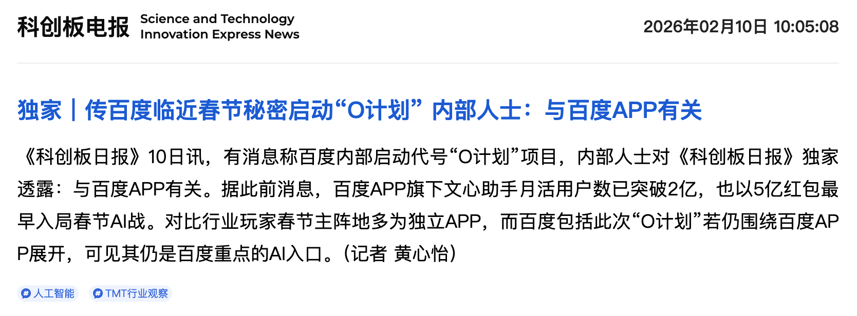 2026年2月10日,《科创板日报》报道称,临近春节,百度已秘密启动“O计划” 。内部人士透露,“O计划”与百度App有关。