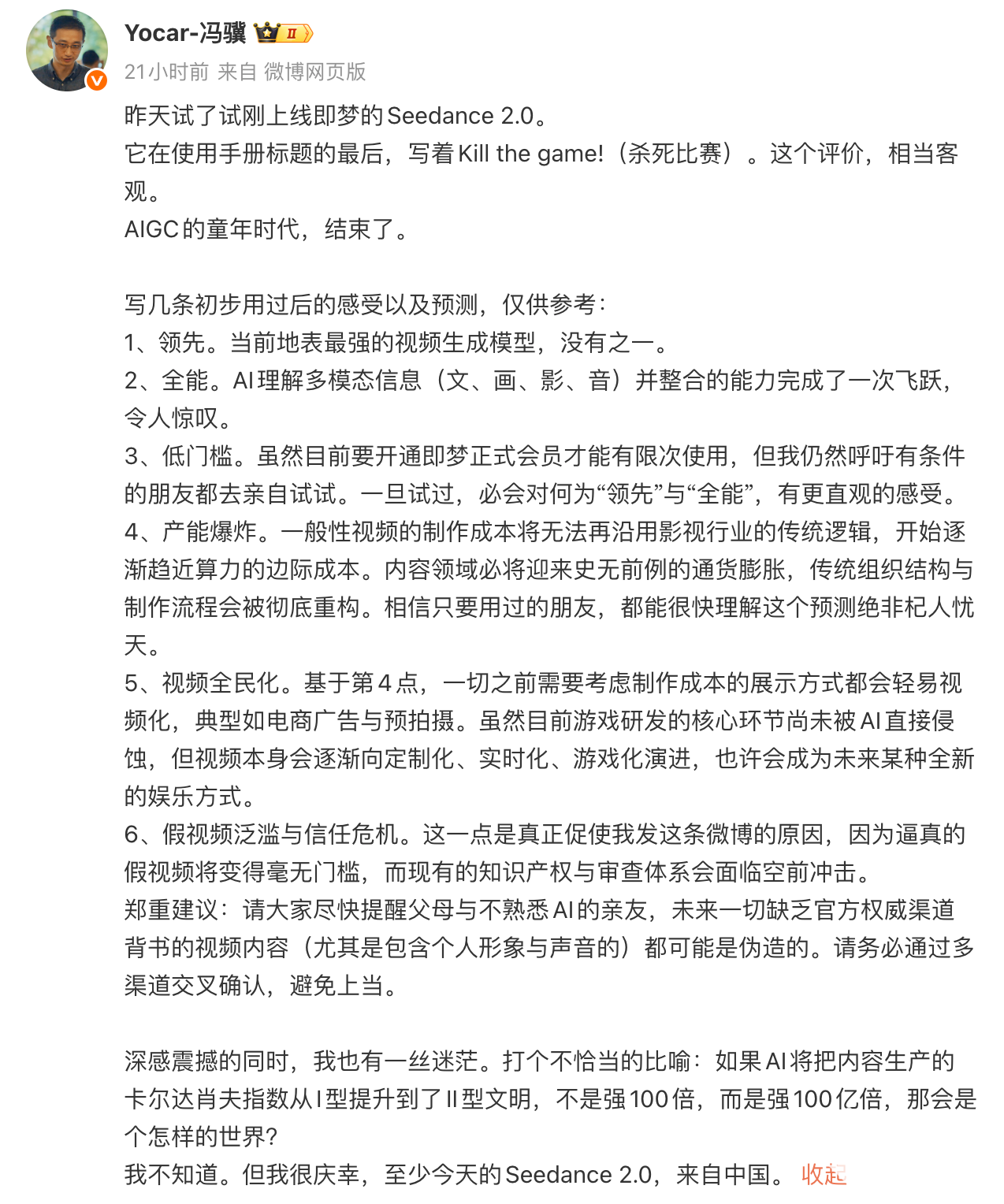 冯骥评价,Seedance 2.0是当前全球领先的视频生成模型,堪称“地表最强”。该模型在多模态信息整合能力上实现突破,能精准理解文、画、影、音等多种信息并完成融合创作,且使用门槛大幅降低,仅需开通会员即可体验,直观展现出领先的技术实力。 冯骥同时对技术发展做出多重预测,认为Seedance 2.0将推动视频制作成本大幅下降,趋近算力边际成本,影视行业传统制作流程和组织结构将被重构,内容领域迎来产能爆炸式增长,电商广告等场景也将实现视频化全民创作,甚至可能催生定制化、游戏化的全新娱乐方式。