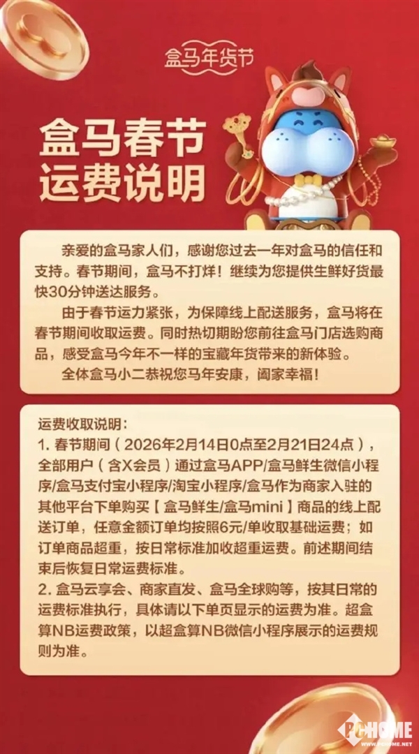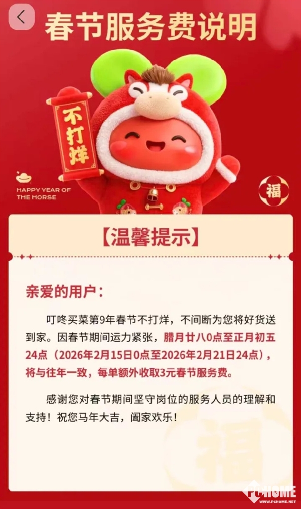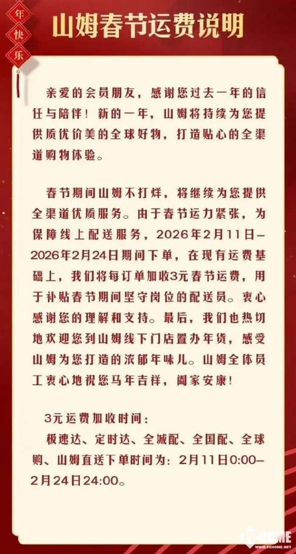 根据公告,山姆线上配送服务于2月11日-2月24日期间,每单加收3元春节运费,用于补贴在岗骑手;盒马于2月14日-2月21日期间,对所有用户统一按6元/单收取基础运费,包括盒马旗下各平台的X会员与普通用户;叮咚买菜于2月15日-2月21日期间,每单额外收取3元春节服务费,与往年标准一致。三家平台均明确“春节不打烊”,保障年夜饭食材、民生商品及时配送。