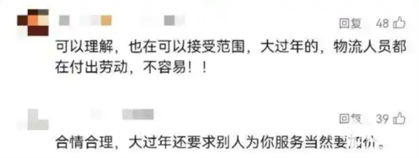 平台表示,春节期间用工成本上升、配送压力加大,临时调价旨在稳定运力、提升服务质量,确保商品及时送达。不少网友对此表示理解,并称:“大过年的,物流人员都在付出劳动,不容易。”