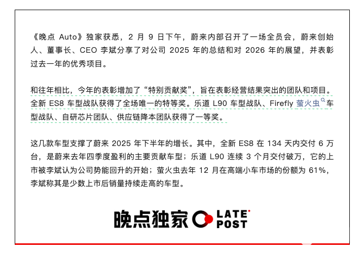 2026年2月10日,《晚点Auto》报道称,2月9日,蔚来召开内部全员会,创始人、CEO李斌对2025年公司发展进行总结并展望2026年发展方向,同时对年度优秀项目及团队进行表彰。