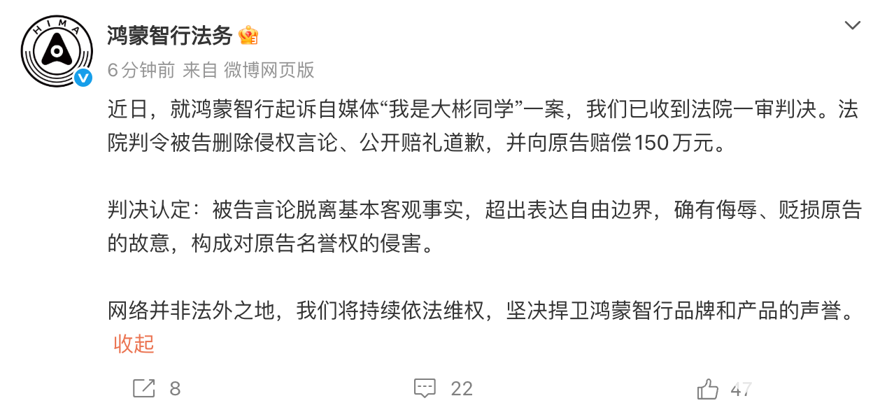 2026年2月11日,鸿蒙智行法务发文称,近日,就鸿蒙智行起诉自媒体“我是大彬同学”一案,我们已收到法院一审判决。法院判令被告删除侵权言论、公开赔礼道歉,并向原告赔偿150万元。