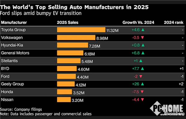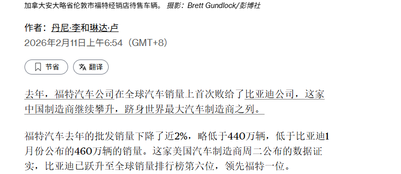 2026年2月11日,据彭博社报道,2024年比亚迪以460万辆的销量成绩,首次超越美国福特汽车,成功跻身全球车企销量前六。