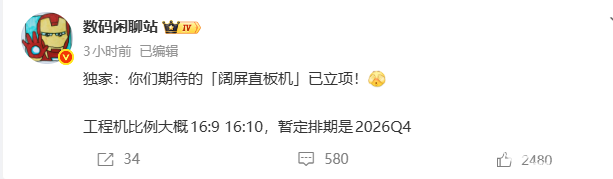 2026年2月11日,据博主“数码闲聊站”爆料,华为阔屏直板机项目已正式立项,工程机屏幕比例为16:9/16:10,排期暂定于2026年第四季度发布。