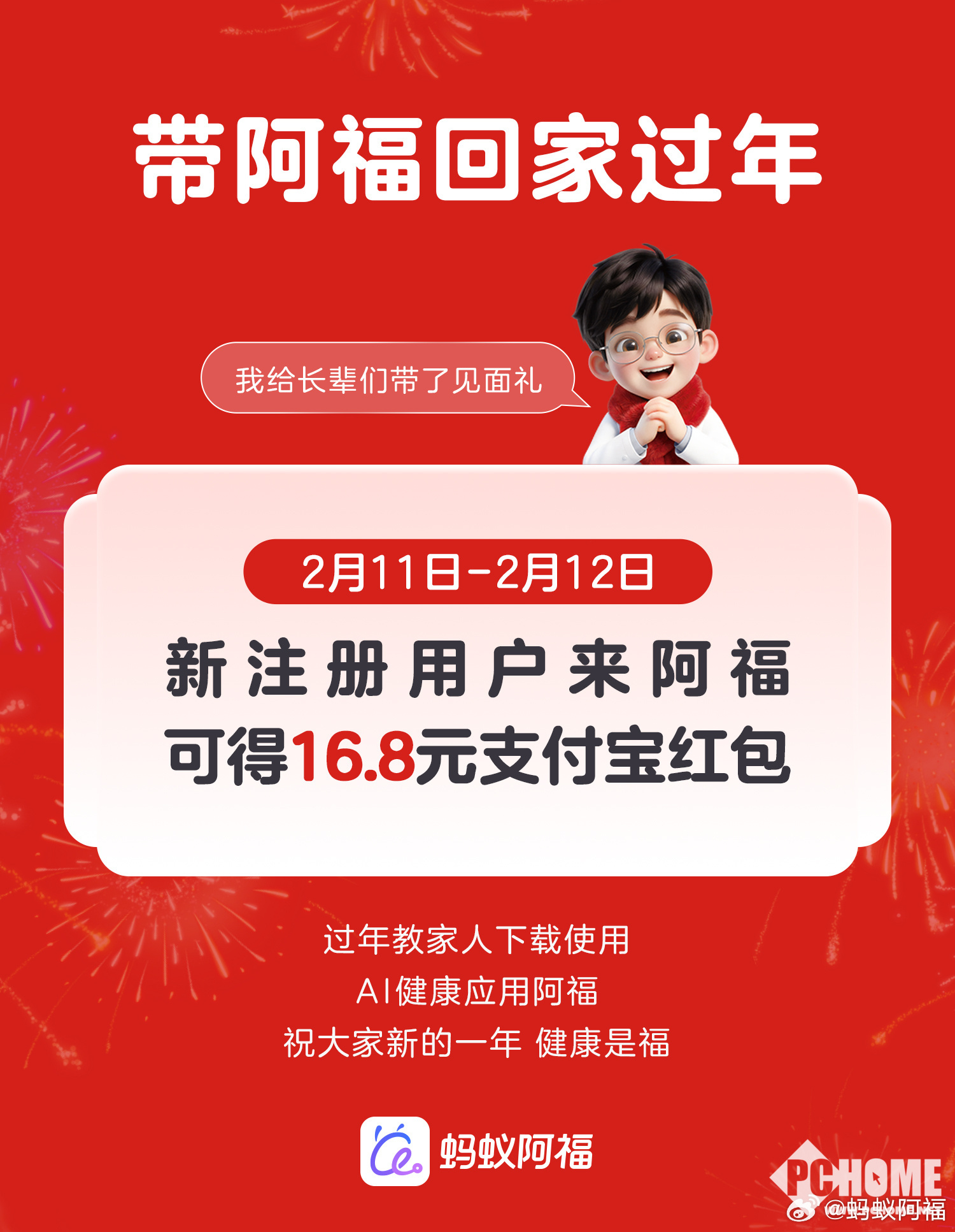 2026年2月11日,蚂蚁阿福官微发布消息称,开启支付宝红包活动 ,2月11日-2月12日新注册用户在蚂蚁阿福App可得16.8元支付宝红包。