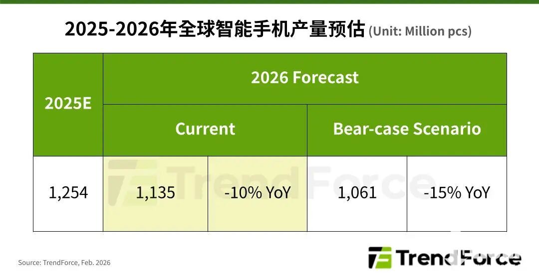 2026年2月11日,TrendForce集邦咨询发布最新研报指出,受存储器价格大幅上涨影响,2026年全球手机产量将迎来显著下滑,常规情境下年衰退幅度达10%,总量预计降至11.35亿支,若市场走入悲观情境,减产幅度甚至会扩大至15%以上。