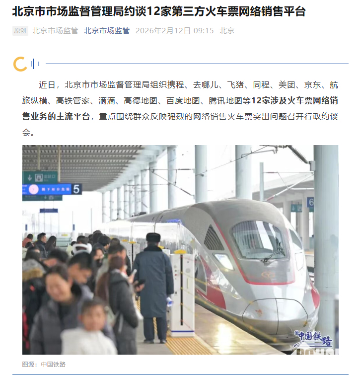 2026年2月12日消息,近日,北京市市场监督管理局针对春运期间群众反映强烈的购票乱象,组织携程、去哪儿、飞猪、同程、美团、京东、航旅纵横、高铁管家、滴滴、高德地图、百度地图、腾讯地图共12家第三方火车票网络销售平台召开行政约谈。