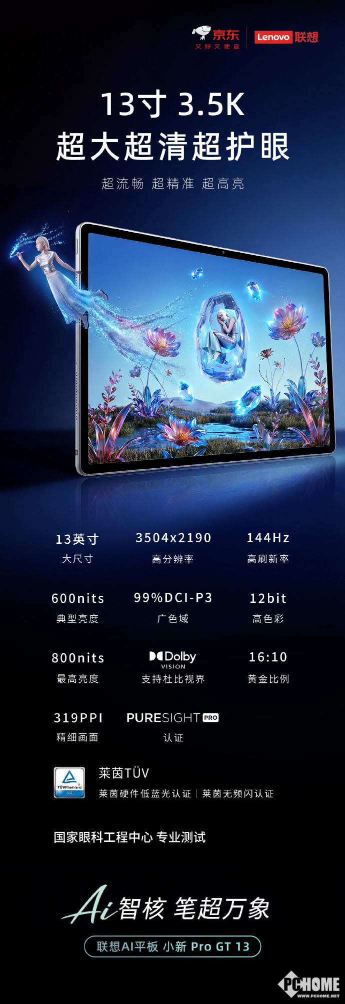 该平板搭载13英寸3504×2190分辨率16:10大屏,配备144Hz高刷新率、319PPI像素密度,典型亮度600nits、峰值亮度800nits,支持12bit色深与99% DCI-P3广色域、杜比视界,通过PureSight Pro专业显示认证。同时搭载多重护眼方案,通过莱茵 TÜV硬件低蓝光、无频闪认证与国家眼科工程中心专业测试。