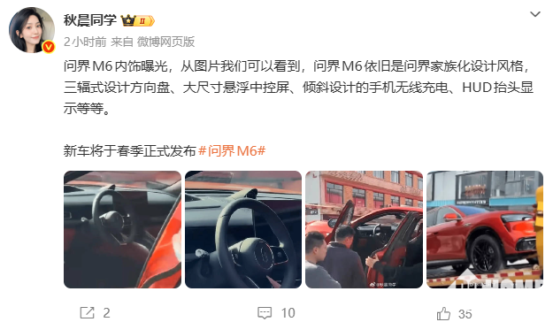 2026年2月12日,博主“秋晨同学”分享了一组鸿蒙智行问界M6汽车的内饰谍照,新车延续家族化设计风格,配备三幅式方向盘、大尺寸悬浮中控屏、倾斜设计的手机无线充电、HUD抬头显示、怀挡换挡等实用配置。