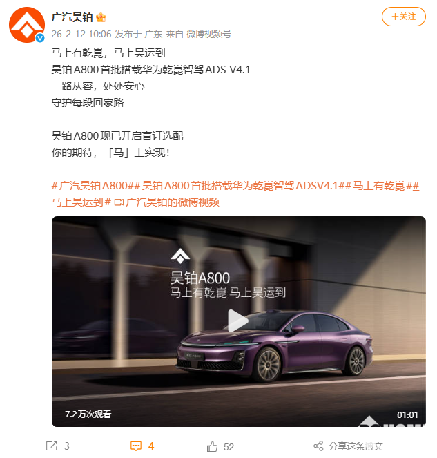 2026年2月12日,广汽昊铂正式宣布,旗下轿车昊铂A800将首批搭载华为乾崑智驾ADS V4.1。